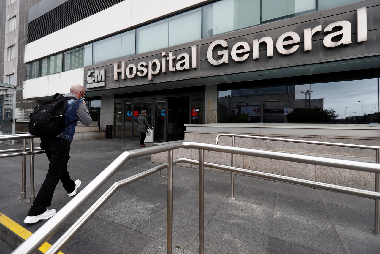 A photo taken on March 19, 2020 shows people with masks at La Paz hospital in Madrid, Spain.