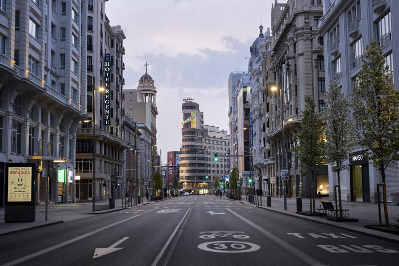 An empty thoroughfare in Madrid on March 19, 2020. The Spanish government wants to prolong restrictions on movement which prevent Spaniards from leaving their houses for all but essential trips.