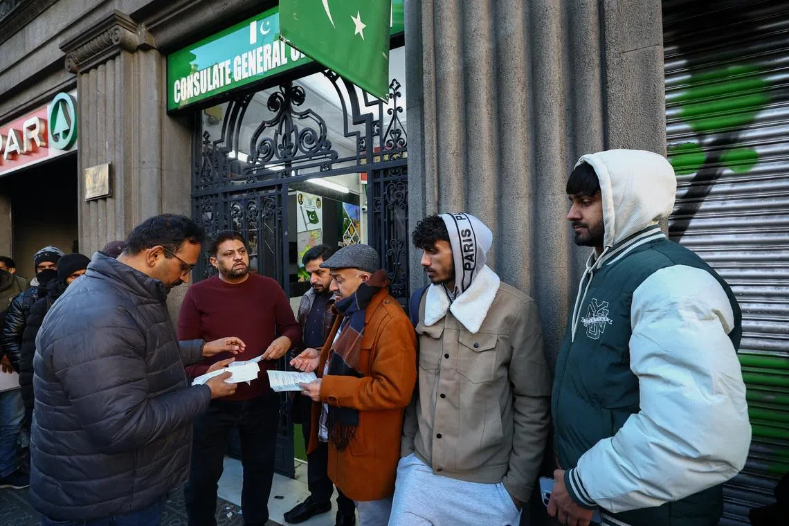 People queue outside Pakistan’s consulate in Barcelona to apply for criminal record certificates, a document required for the migrant regularisation programme recently announced by the Spanish government.