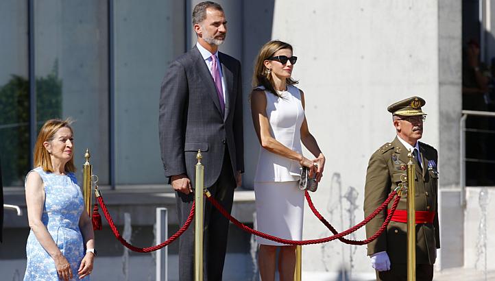 The Spokeswoman of the Lower Chamber of the Spanish Parliament Ana Pastor (left) stands next to Spanish King Felipe VI and Queen Letizia upon their arrival to the official farewell ceremony at Adolfo Suarez Barajas airport in Madrid, Spain on July 11, 2017.