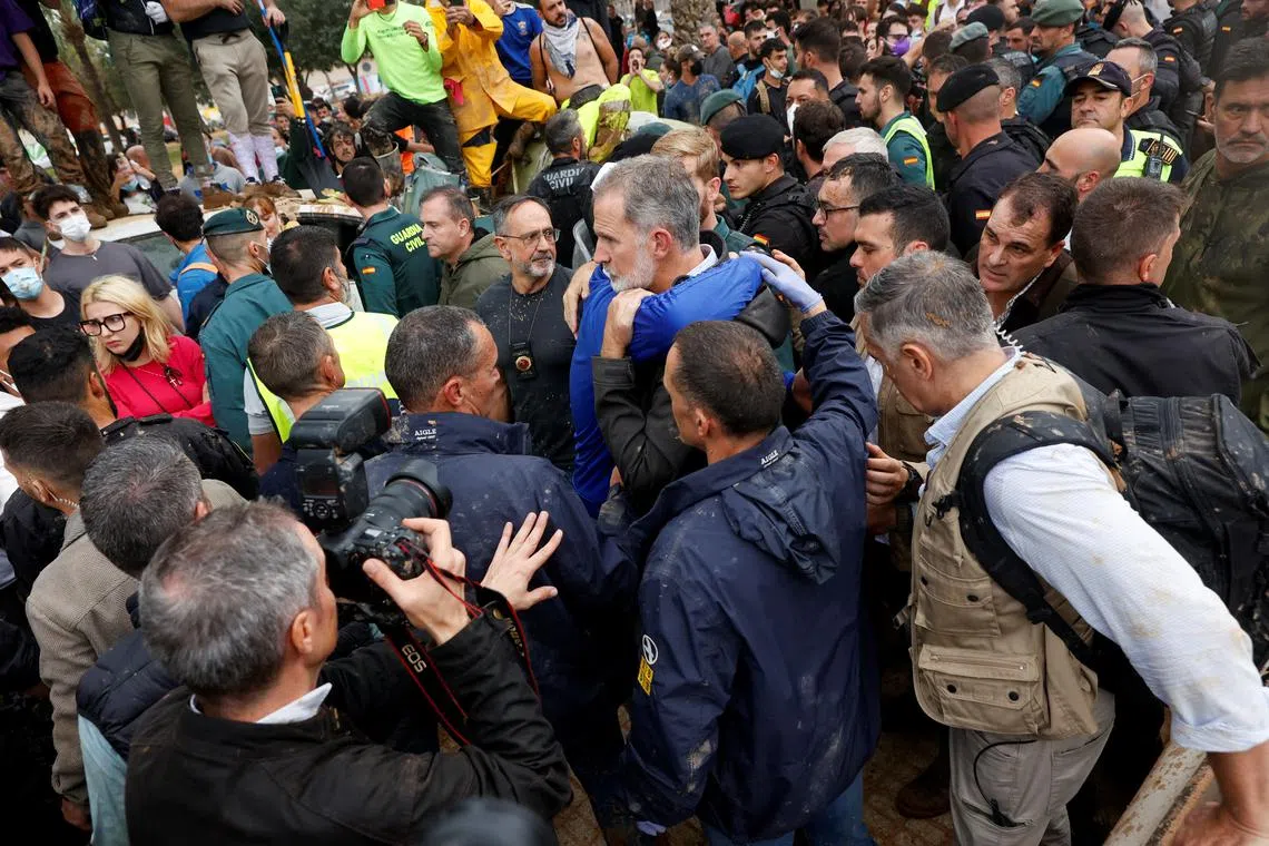 PAIPORTA, Spain - Hundreds of residents of a Valencia suburb particularly badly hit by last week’s deadly floods protested on Nov 3 during a visit by Spanish King Felipe and Prime Minister Pedro Sanchez, with some throwing mud at them.