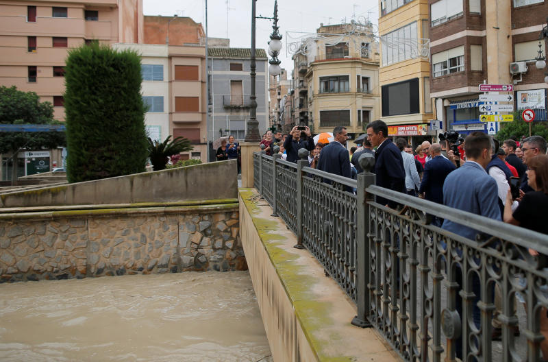 Spanish Prime Minister Pedro Sanchez visits the bridge over Segura river in a flooded town of Orihuela, Spain, on Sept 14, 2019.