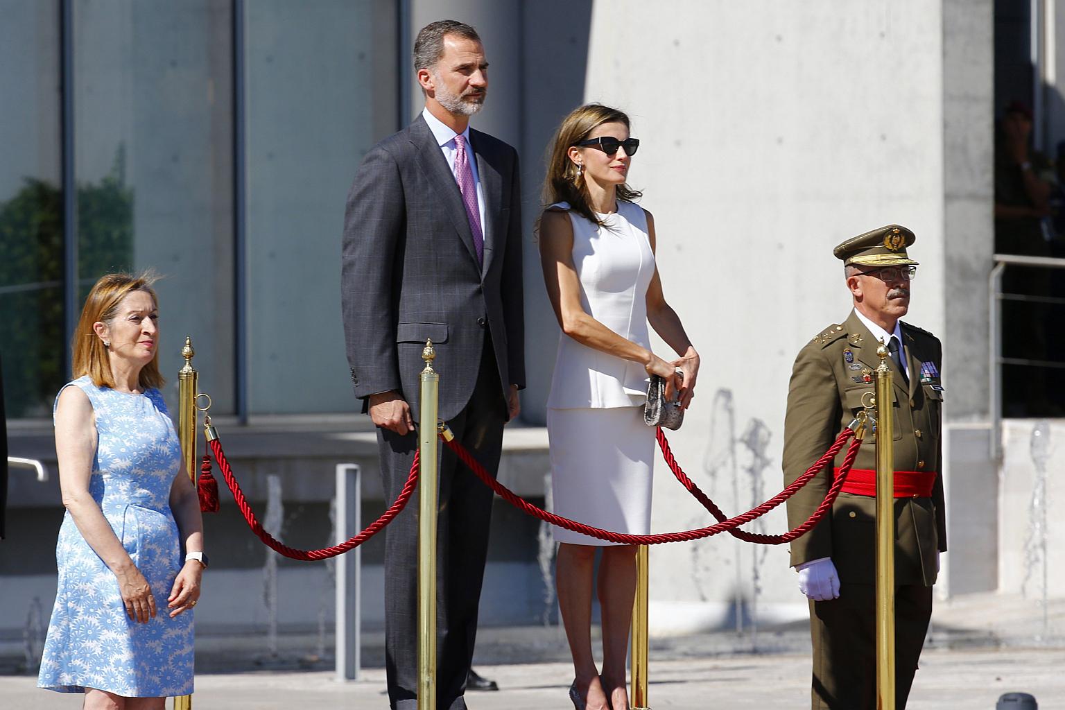 The Spokeswoman of the Lower Chamber of the Spanish Parliament Ana Pastor (left) stands next to Spanish King Felipe VI (second left) and Queen Letizia upon their arrival to the official farewell ceremony at Adolfo Suarez Barajas airport in Madrid.