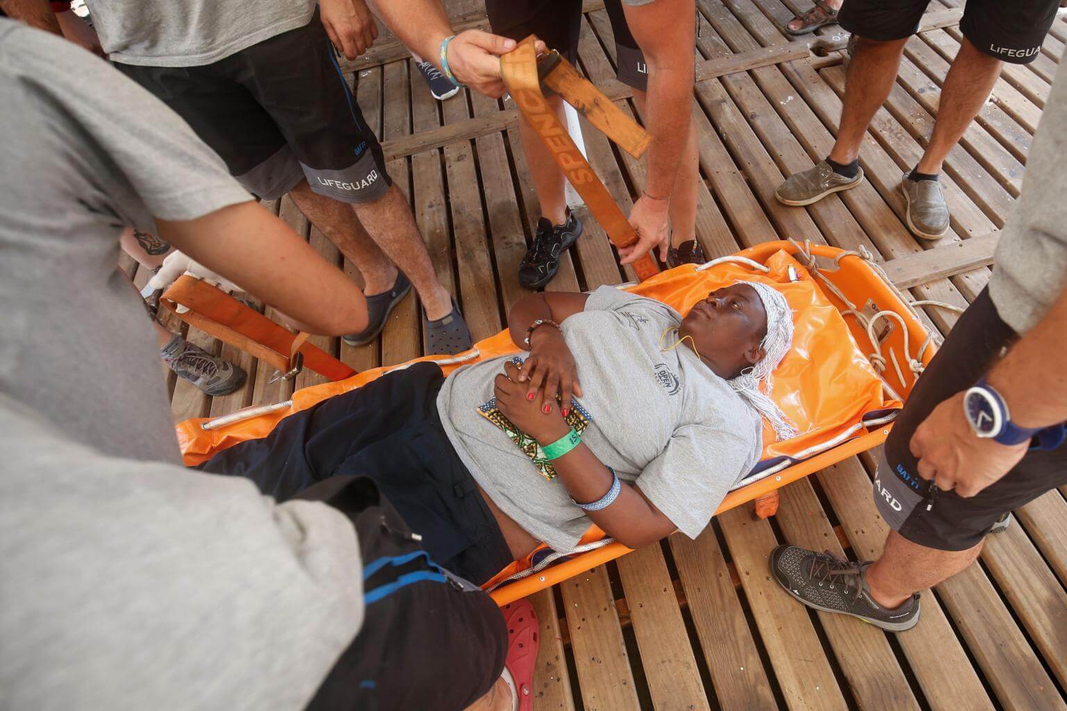 Josepha, a 40-year-old woman from Cameroon who was rescued at sea, lies on a stretcher on board the Proativa Open Arms boat before disembarking in Palma de Majorca, on July 21, 2018.