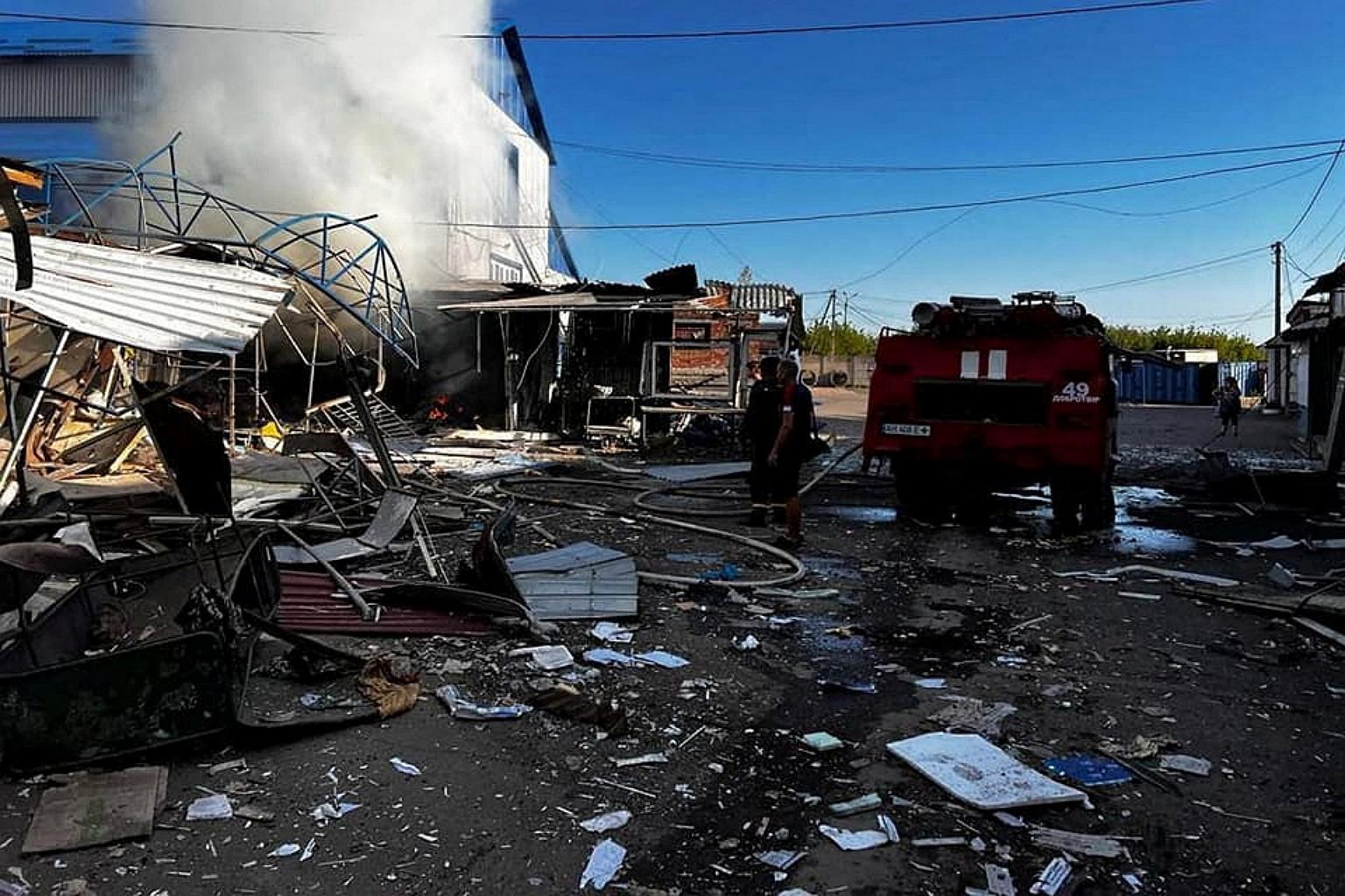 Firefighters working at a market after it was hit by a Russian missile strike, in Bakhmut, Ukraine, on July 30, 2022.