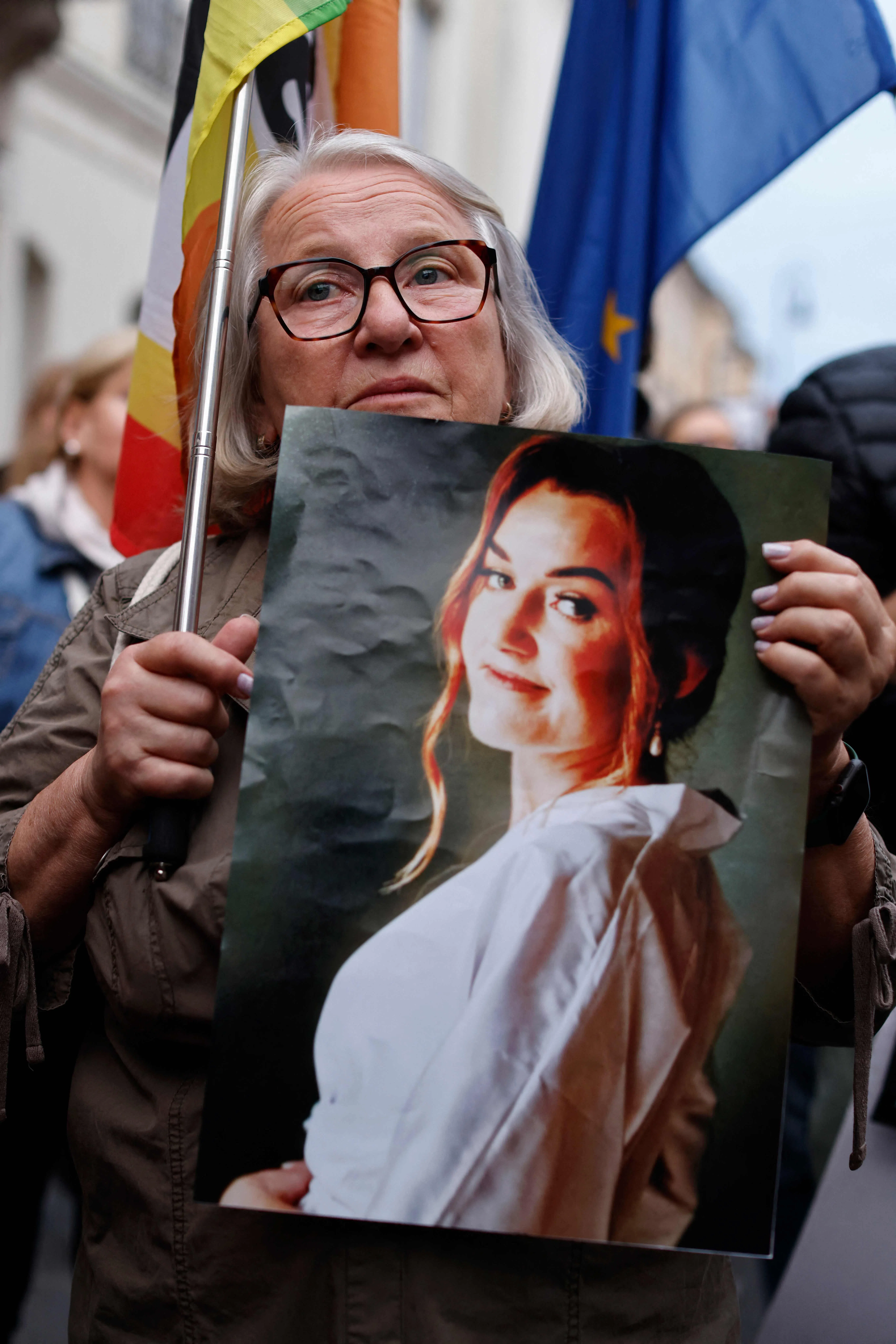 A demonstrator holds up an image of Ms Dorota, who died of septic shock in a hospital after her water broke in the 20th week of pregnancy.