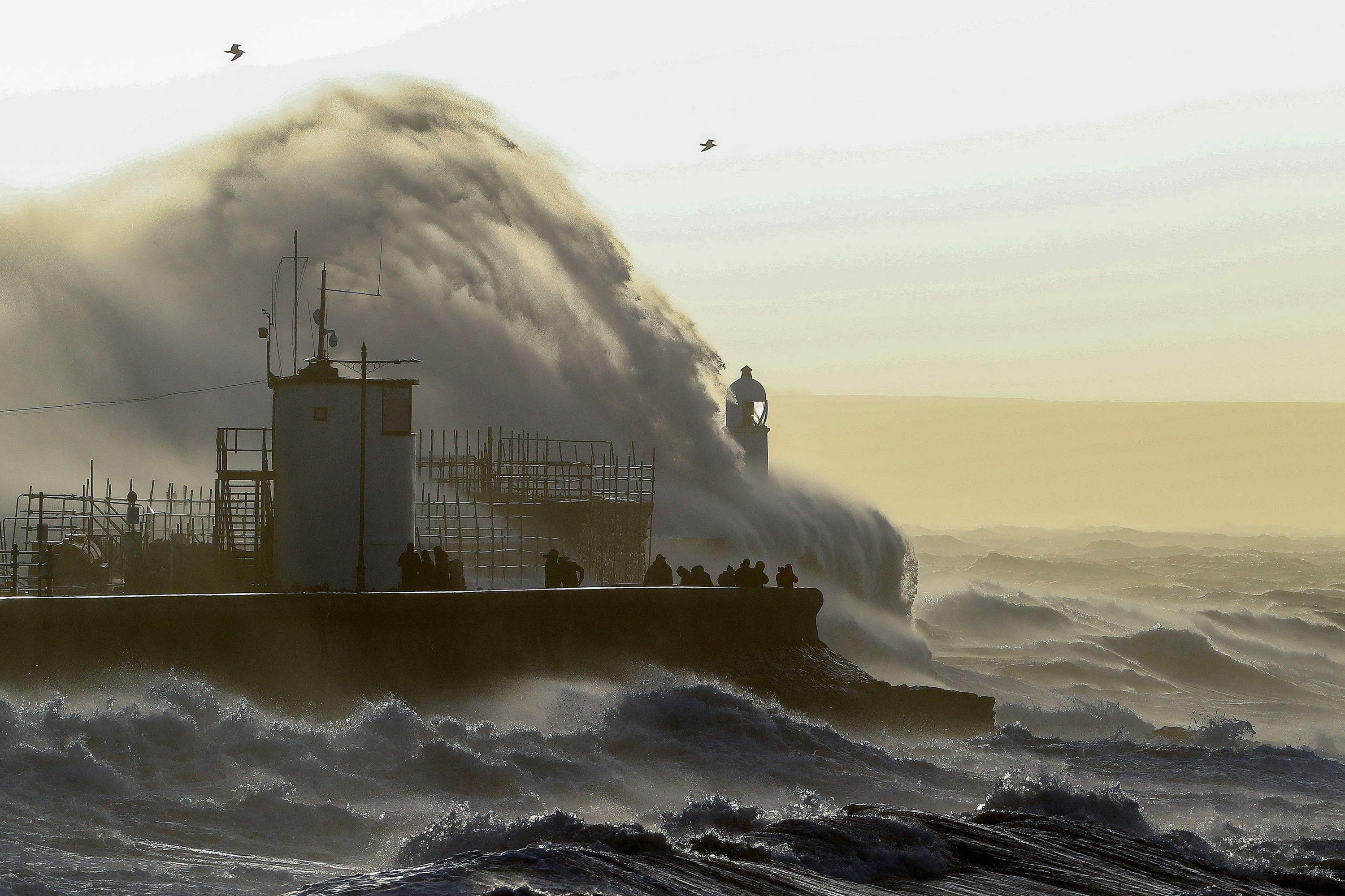 In Wales, waves crashed over Aberystwyth promenade, some as high as houses. More than 100,000 people were hit by power cuts as lines were torn down and ancient trees keeled over.