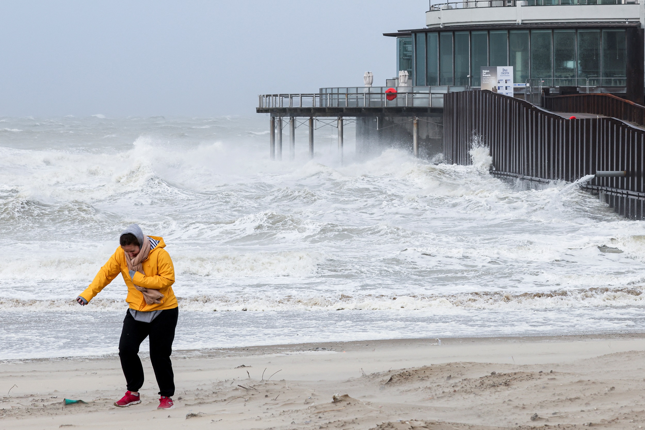 A person walks as waves break on the beach in the wake of Storm Eunice in Blankenberge, Belgium, on Feb 18, 2022.