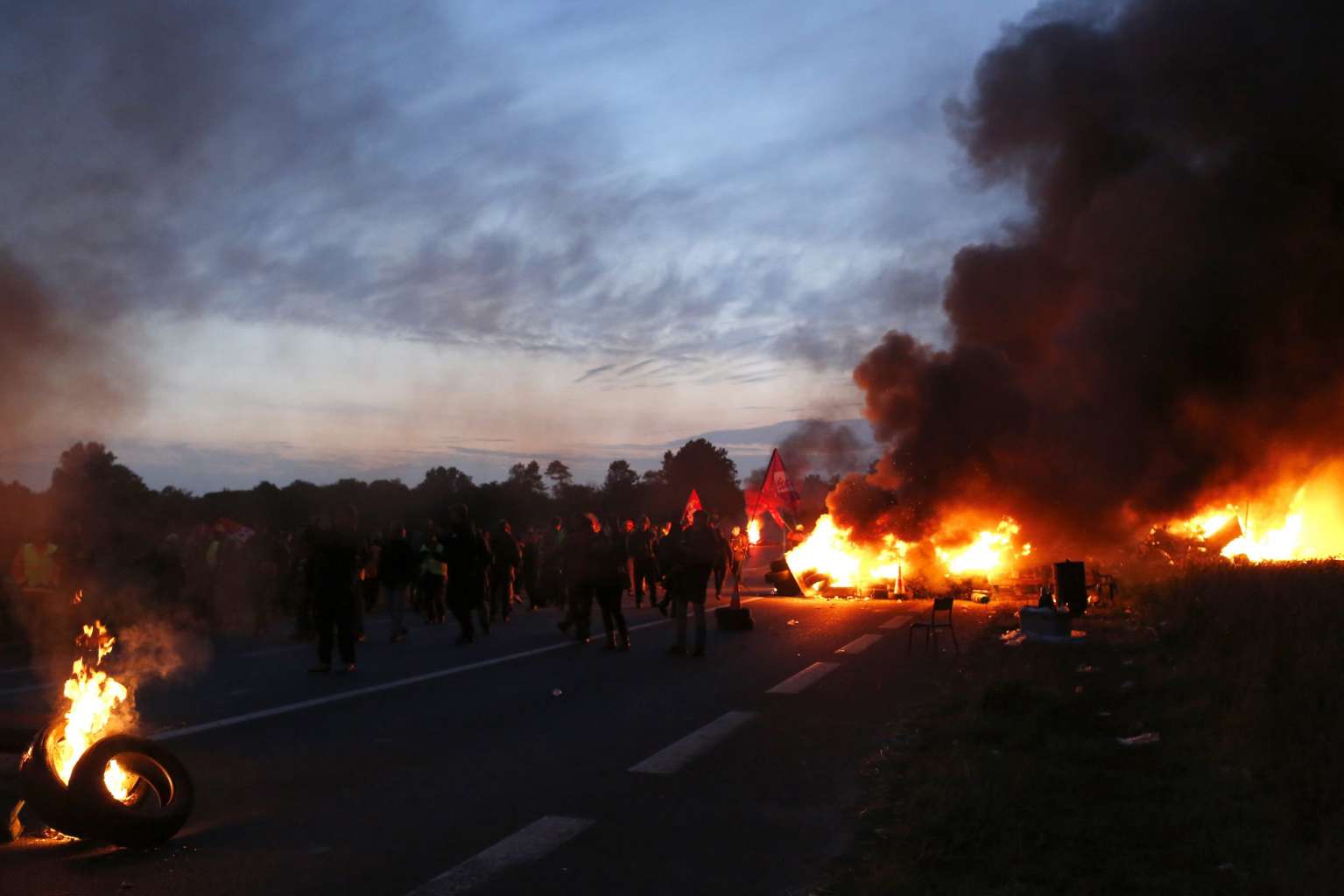 Trade unionists erect a burning barricade to block the entrance of a refinery before being dislodged by French police, in Douchy-les-Mines, France on May 25, 2016.