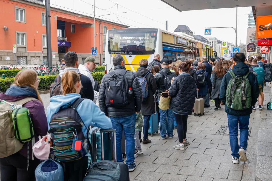 Passengers queuing for a bus to the airport during a railway workers strike in Munich, on April 21, 2023.