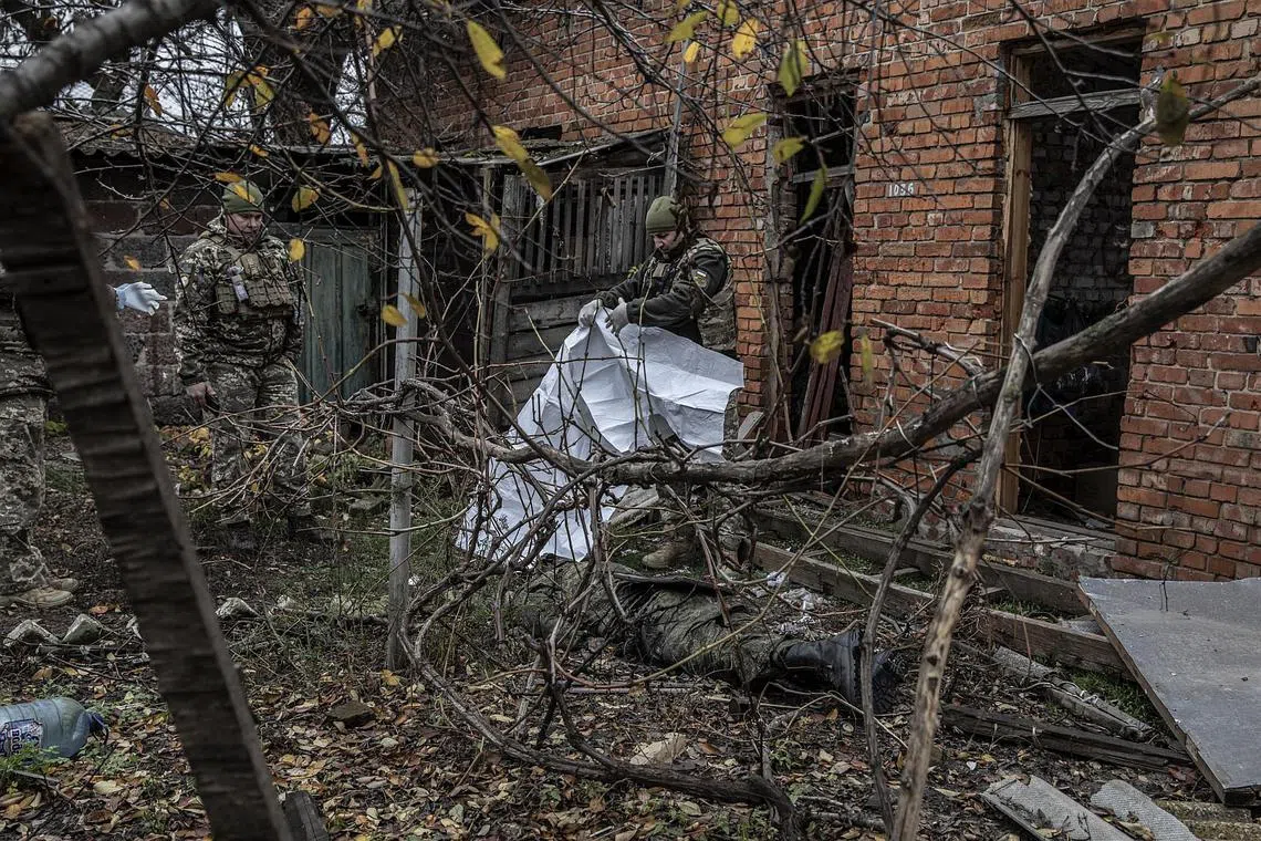 A Ukrainian soldier preparing to remove the body of a Russian soldier in Kupiansk-Vuzlovyi, Ukraine, on Nov 1, 2022.