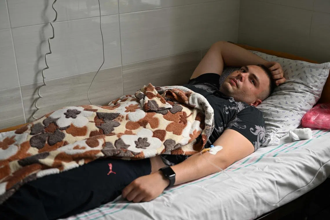 KRAMATORSK, Ukraine - Mykyta lay in a hospital bed with cuts from shrapnel on his face and body after a Russian missile hit the restaurant