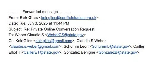“Claudie Weber” used a Gmail address and copied her purported work address and State Department colleagues throughout the exchange with British researcher Keir Giles.