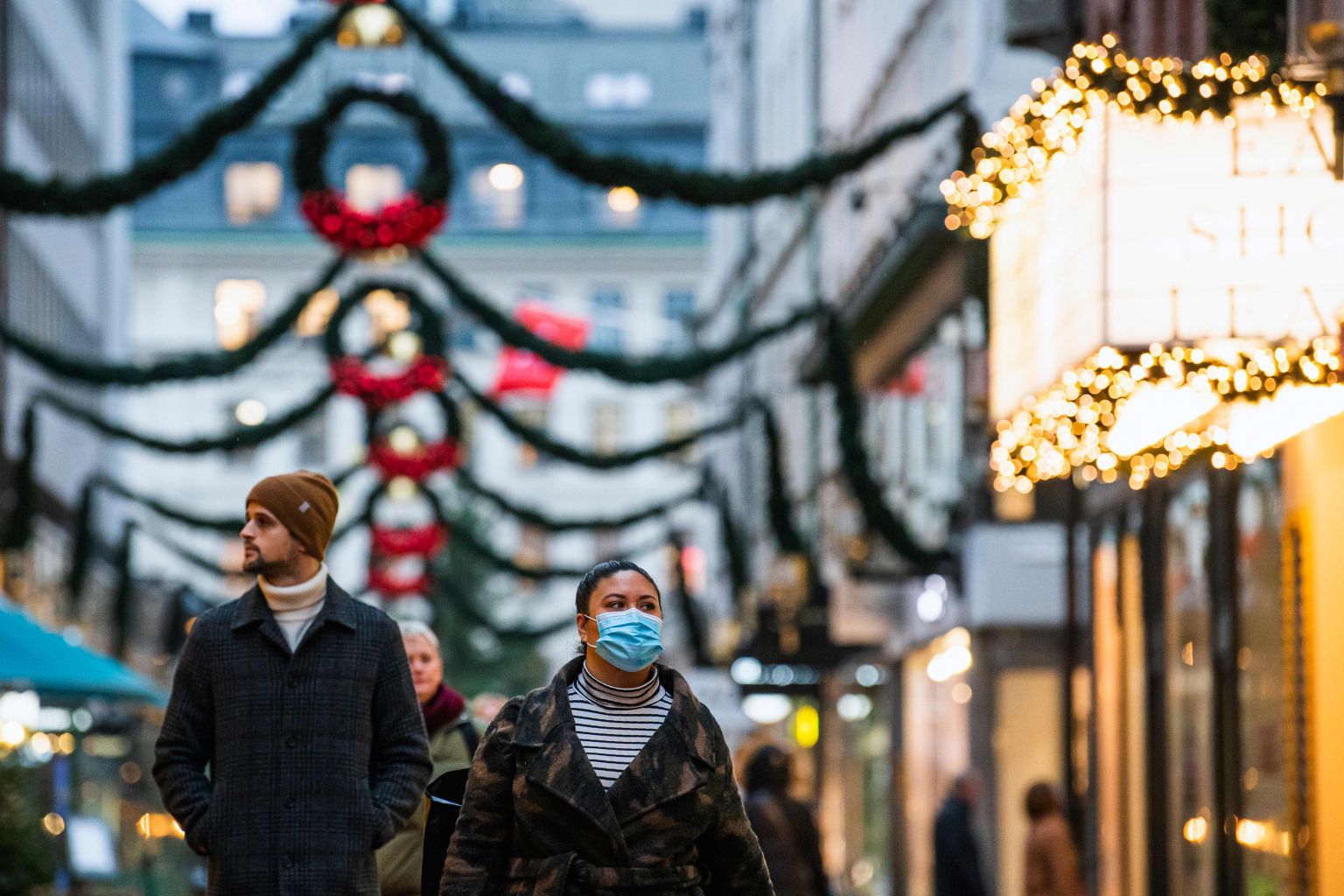 People walk past shops under Christmas decorations in Stockholm on Dec 3, 2020.