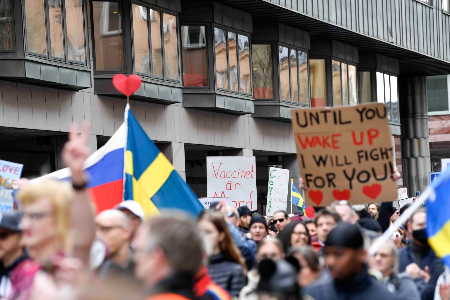 People protest against coronavirus pandemic restrictions, in Stockholm, Sweden, on May 1, 2021.