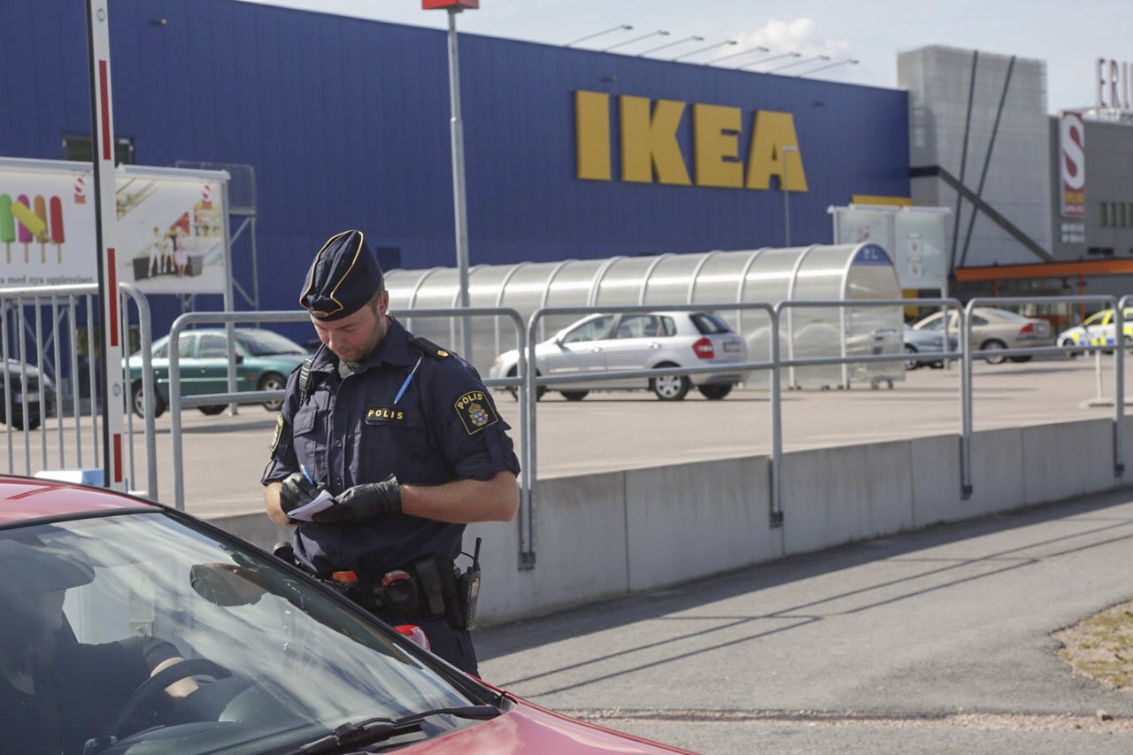 A police officer writes on a notepad as he speaks to a driver near the Ikea store where two people died in a knife attack in Vasteras, central Sweden on Monday.