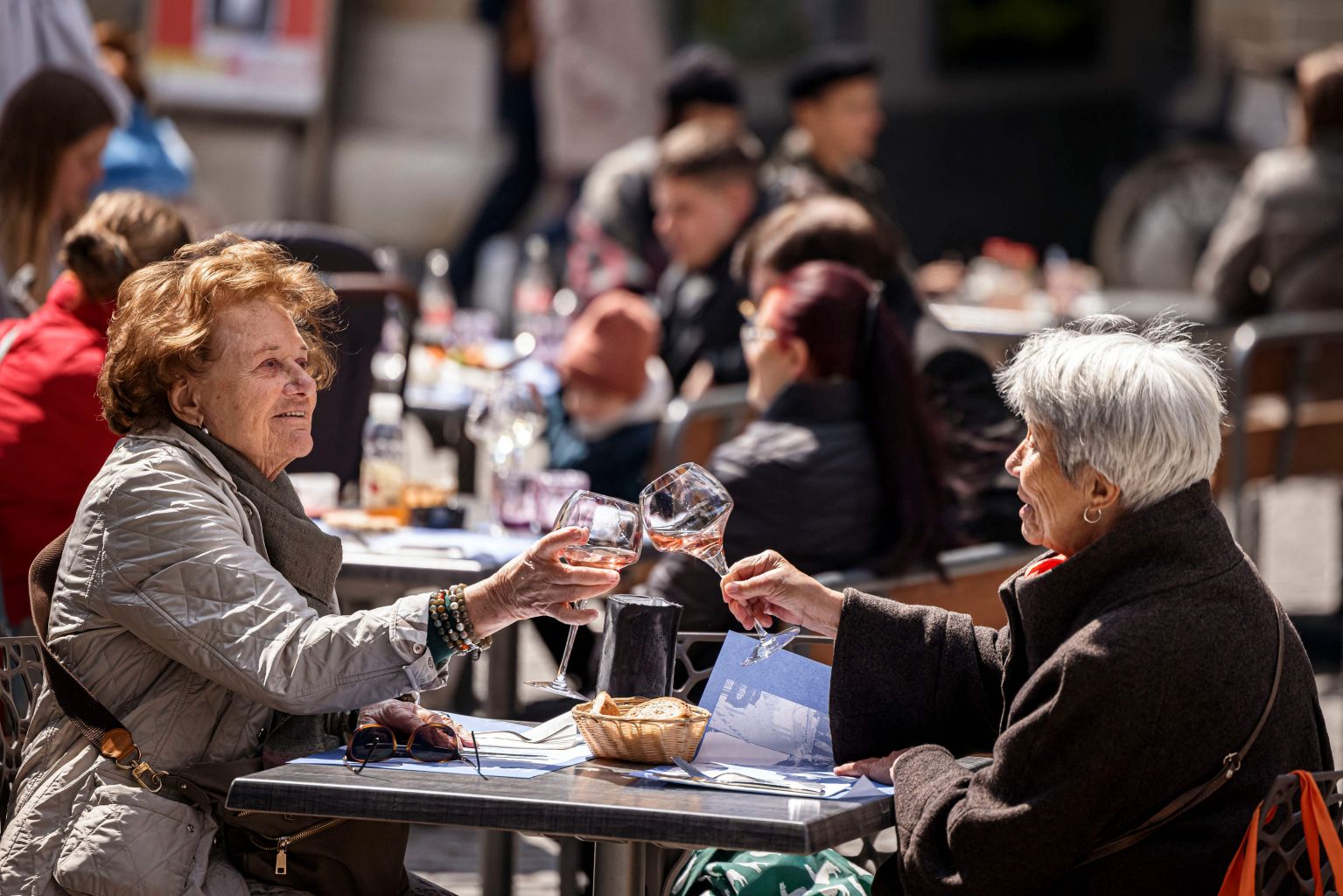Women enjoy a glass of wine as outdoor terraces reopen in Lausanne, Switzerland, on April 19, 2021.