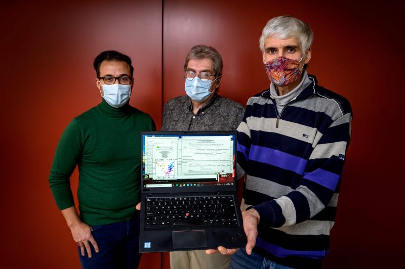 OrphAnalytics CEO Claude Alain Roten with staff members and a laptop using the text analysis software on Jan 6, 2021.