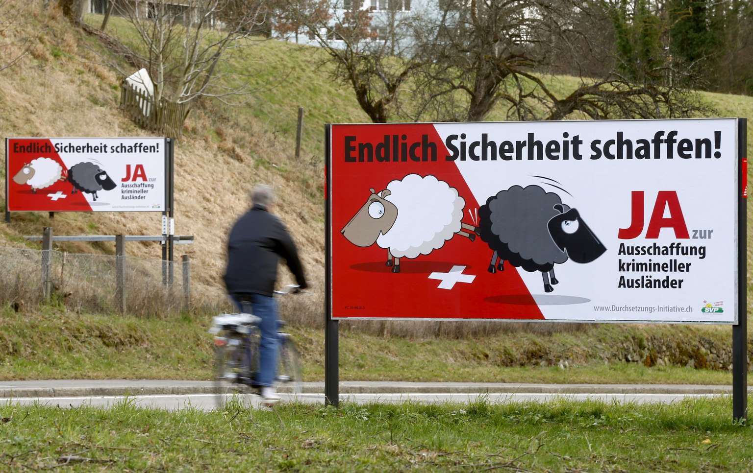 Posters of Swiss People's Party demanding to deport criminal foreigners are displayed beside a road in Adliswil, Switzerland, on Feb 11, 2016.