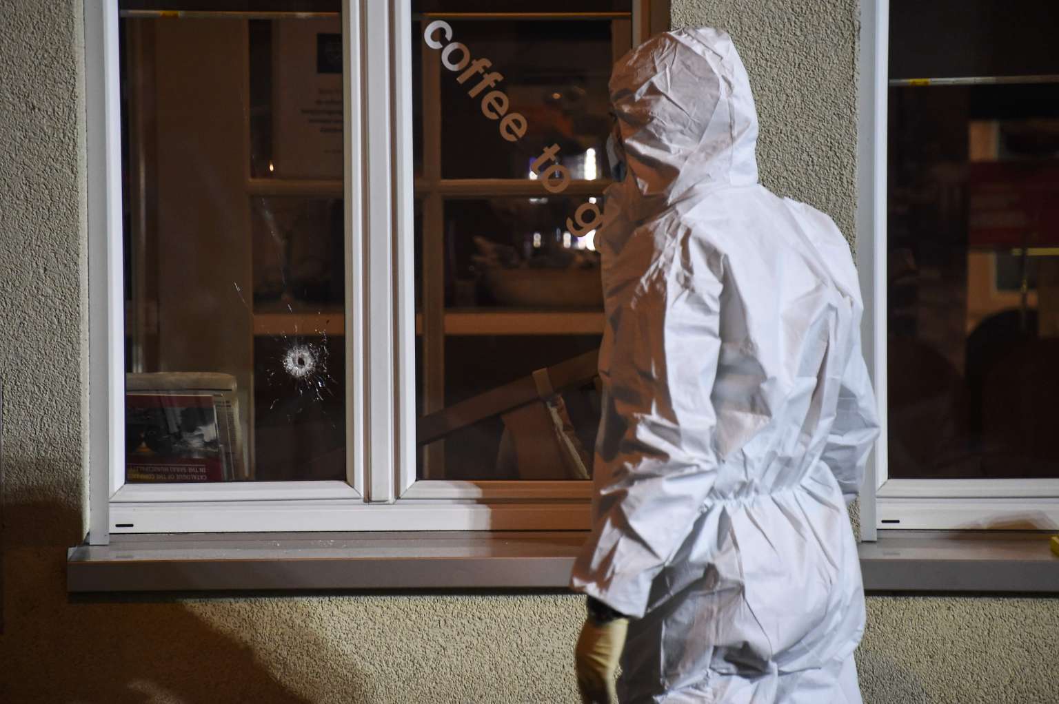 A bullet hole pierced one of the cafe's windows.
