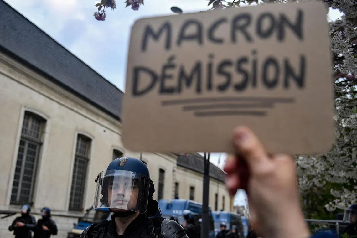 A placard that reads “Macron, resign” at a demonstration against pension reform in a Paris suburb on April 18, 2023.