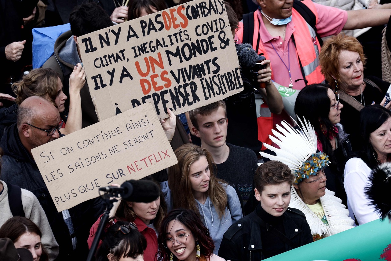 Protesters holding placards reading "If we continue this way, seasons will only be on Netflix" (left) and "There are not fights, Climate, inequality, Covid.... There is one world and living beings to rethink together" during a demonstration against climate change in Brussels, on Oct 10, 2021.