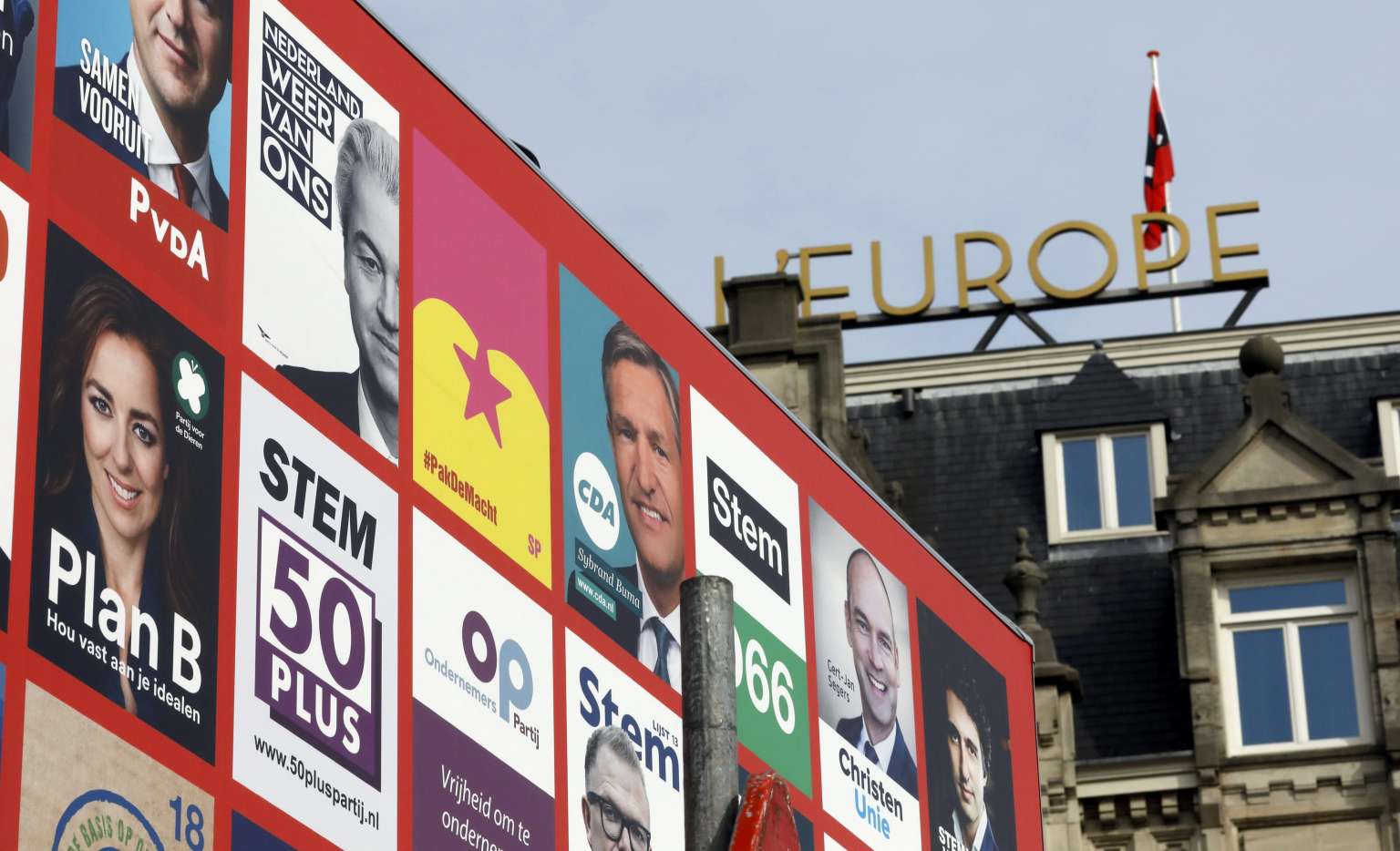 Election campaign posters seen on a hoarding in Amsterdam, Netherlands, on March 11, 2017.