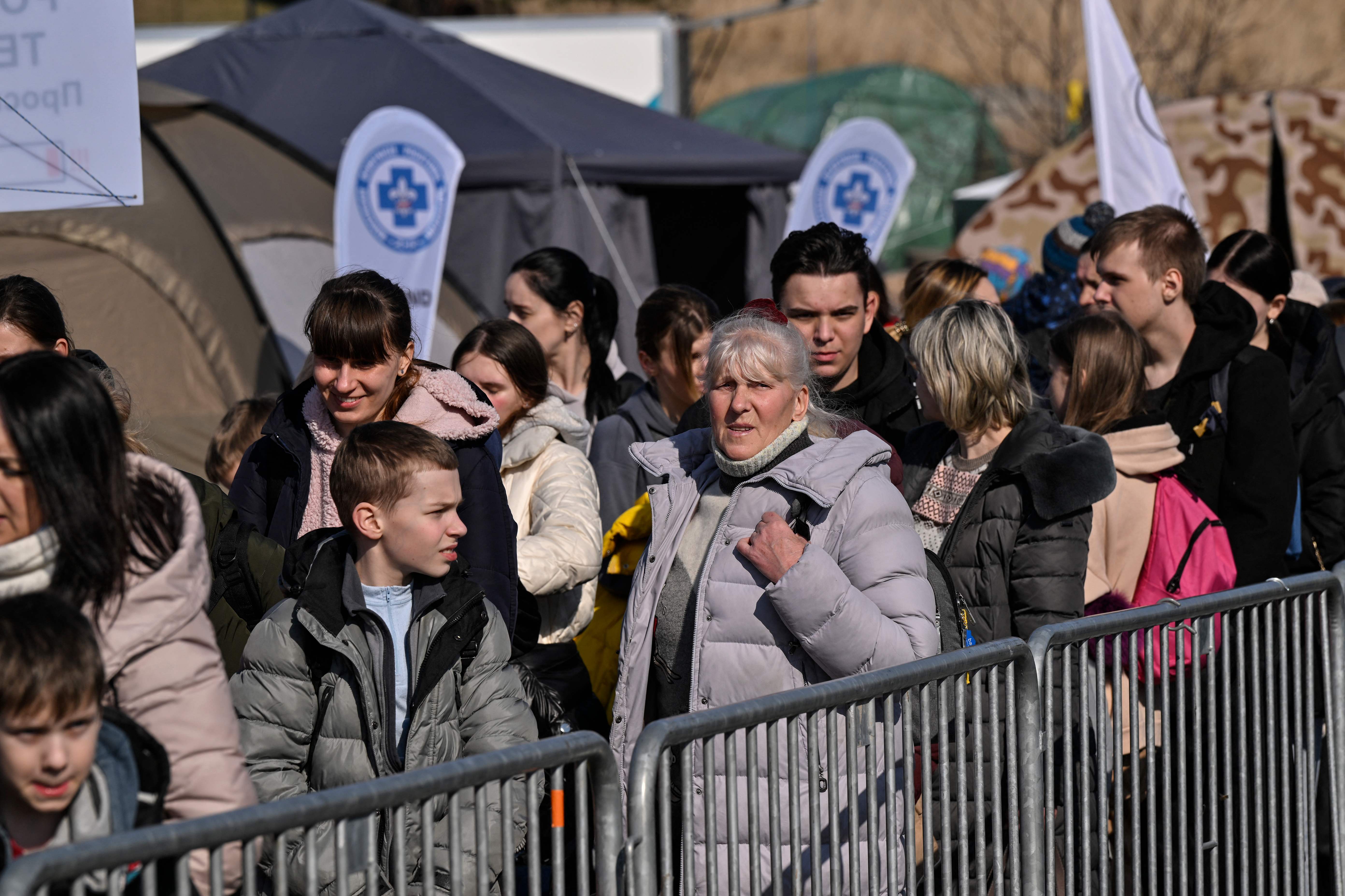 People wait to board buses in Poland after crossing the border from Ukraine, on March 15, 2022.
