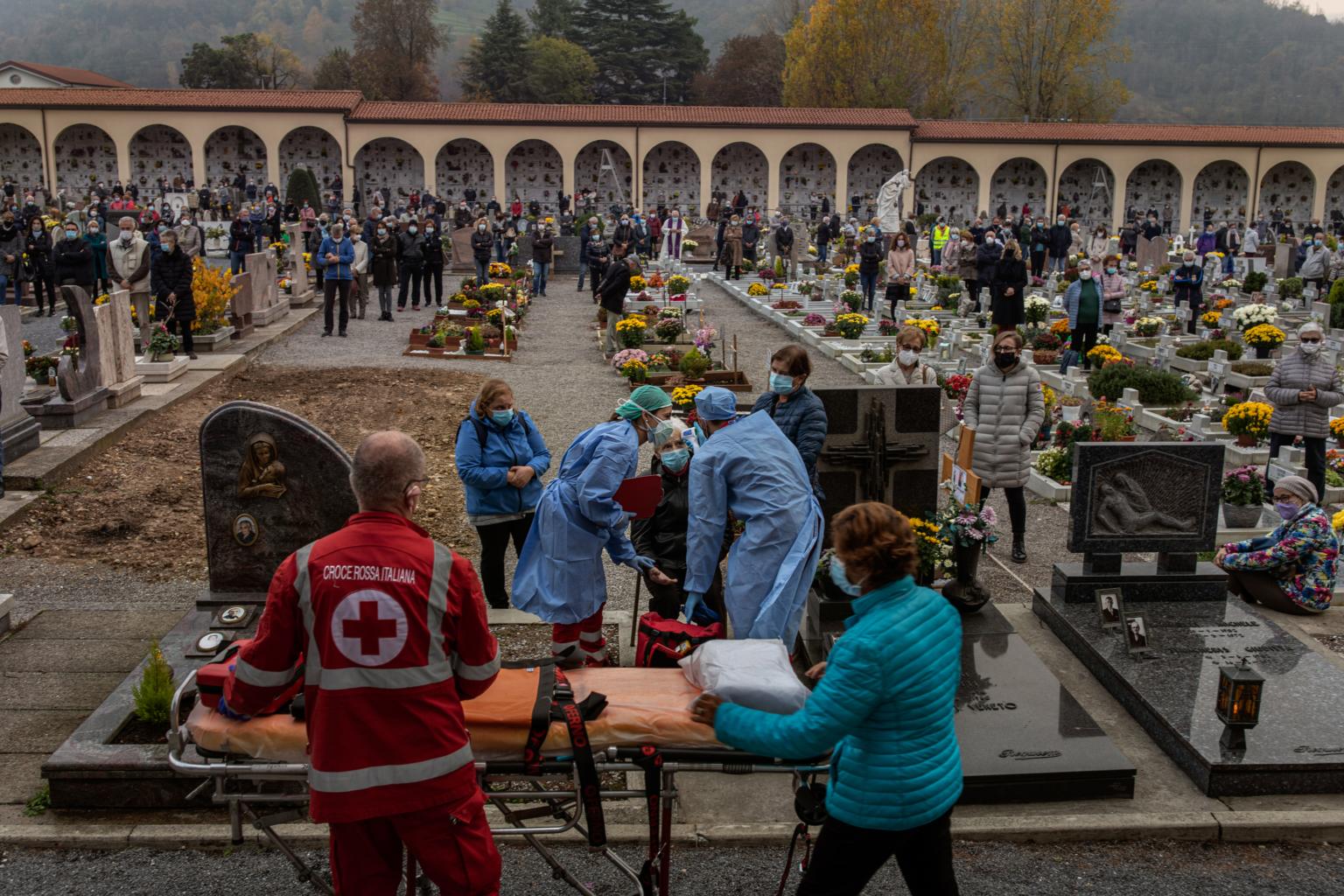 Red Cross workers examine a woman who felt ill during a Mass held to remember Covid-19 victims at a cemetery in the village of Nembro, Italy, on Nov 2, 2020.
