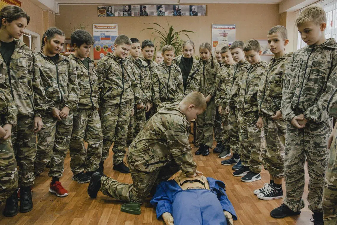 Students in a new school subject called “Fundamentals of Security and Protection of the Motherland” learn first aid skills at a school in Kursk, Russia.