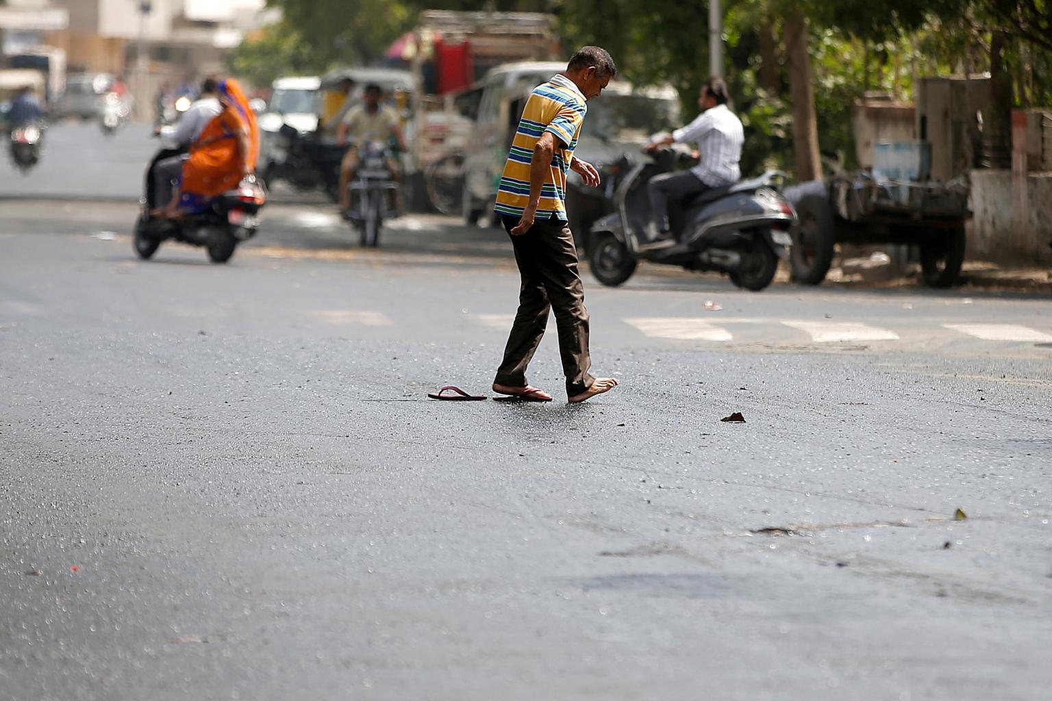 A man struggles to cross a road after his slippers got stuck in melted tar on a hot day in Ahmedabad, India, on May 20, 2022.