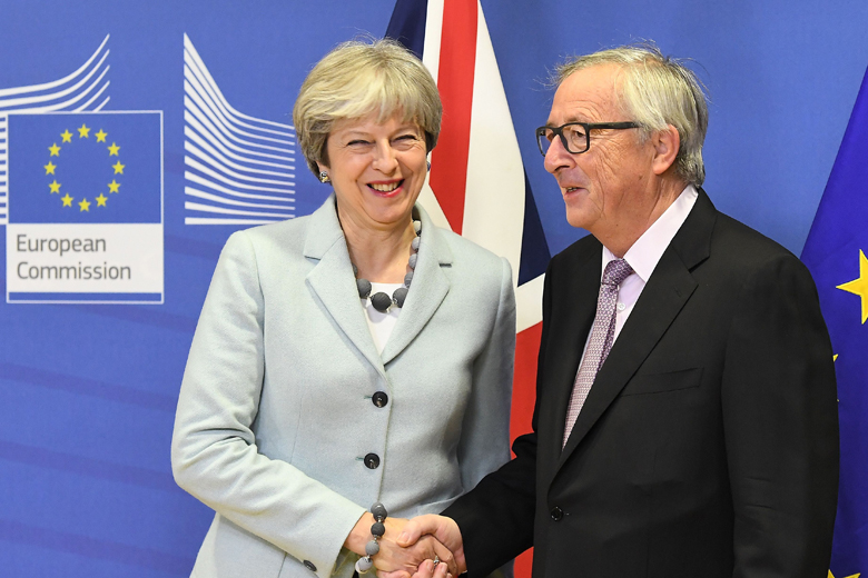 British Prime Minister Theresa May is welcomed by European Commission Jean-Claude Juncker at European Commission in Brussels on Dec 8, 2017.