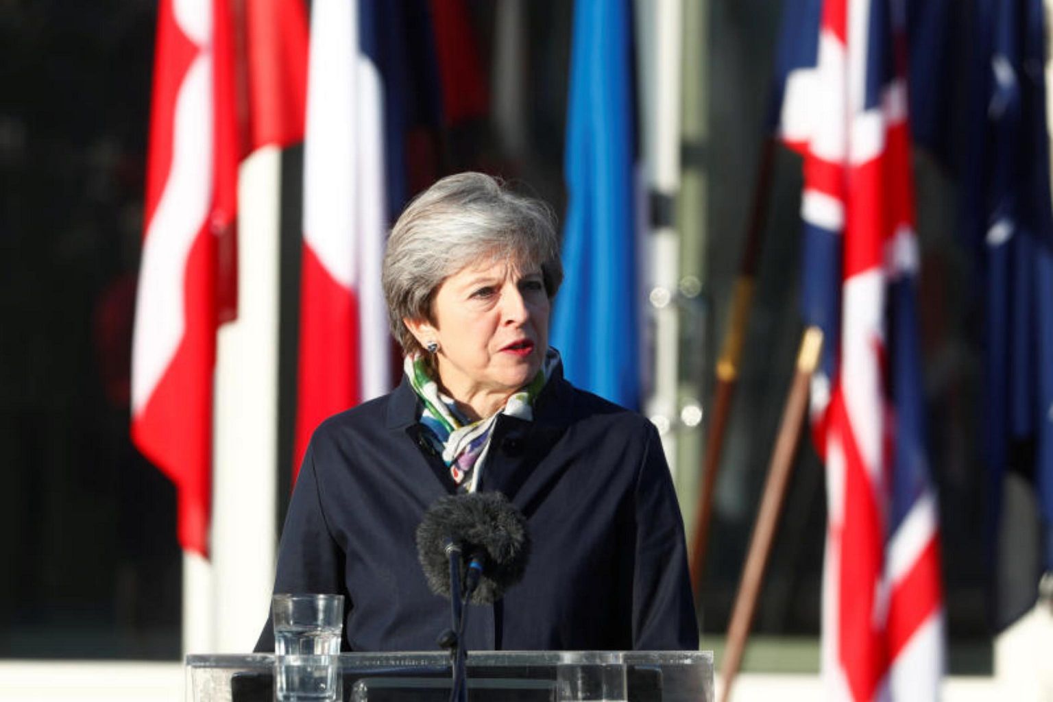 Standing beside French President Emmanuel Macron and Estonia's Juri Ratas, she chatted to some of the 800 troops Britain has deployed at a military base in Tapa, northern Estonia, as part of Nato's moves to defend against a newly assertive Russia on the EU's border.