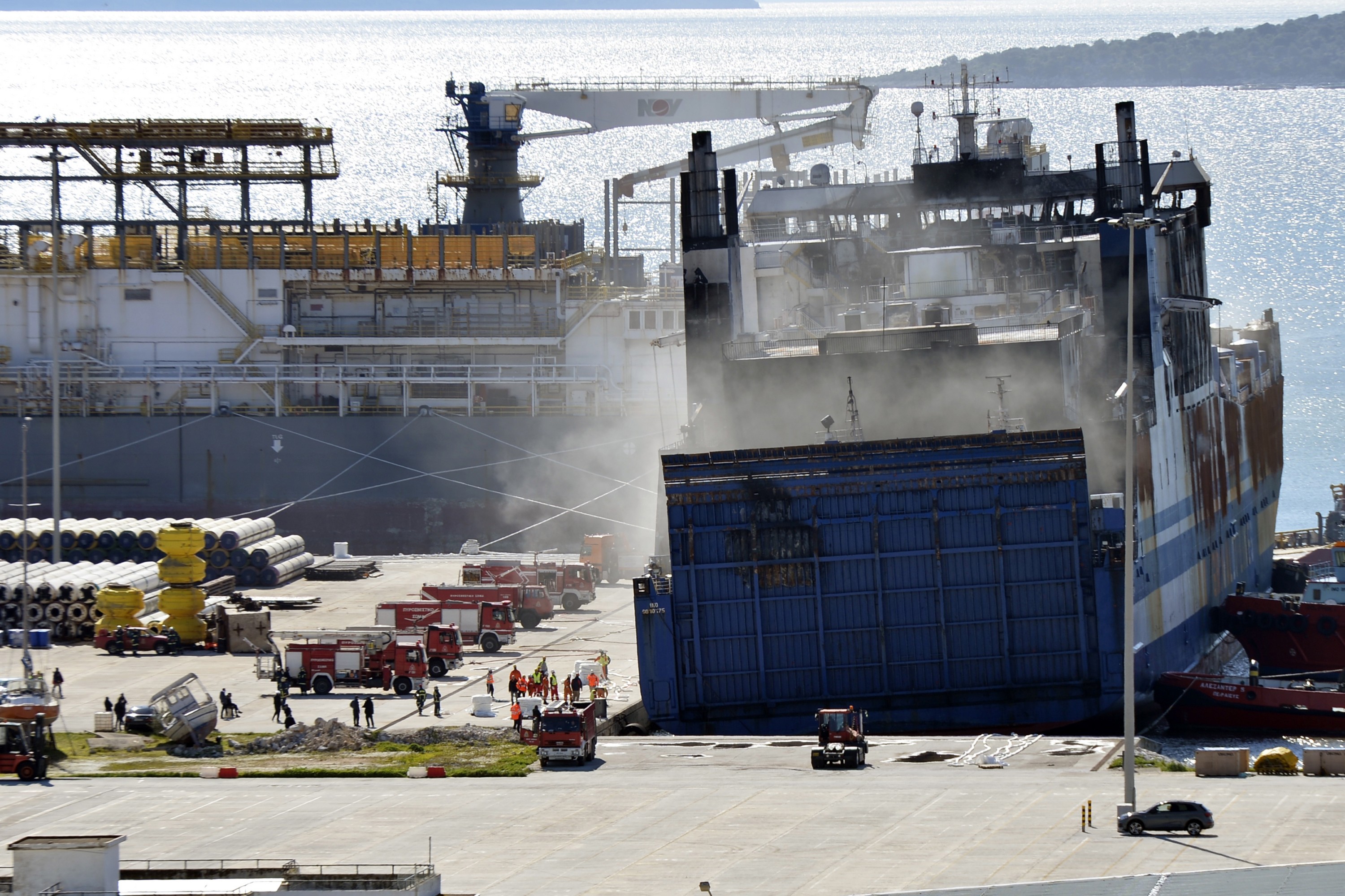 Images from public broadcaster ERT showed the charred remains of burnt-out vehicles in the ferry's hold.