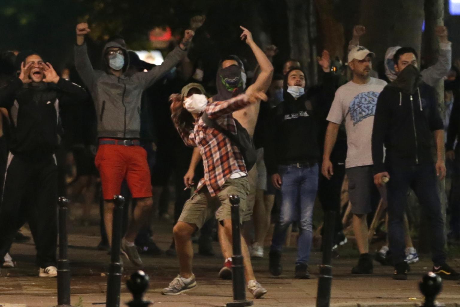 Protesters throw projectiles at police in front of the Serbian Parliament building in Belgrade, Serbia, on July 7, 2020.