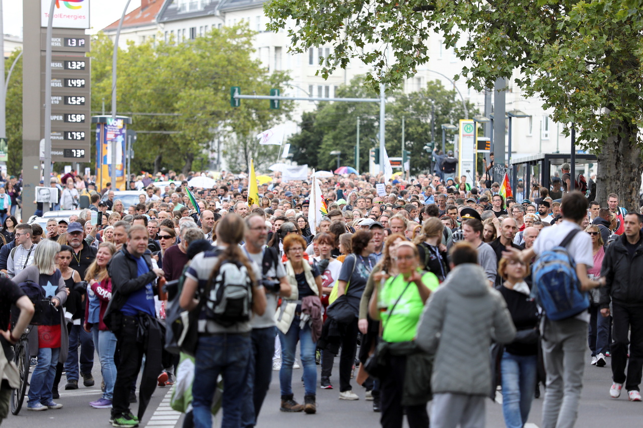 Dozens of police dressed in riot gear sought to control the march through residential streets in eastern Berlin.