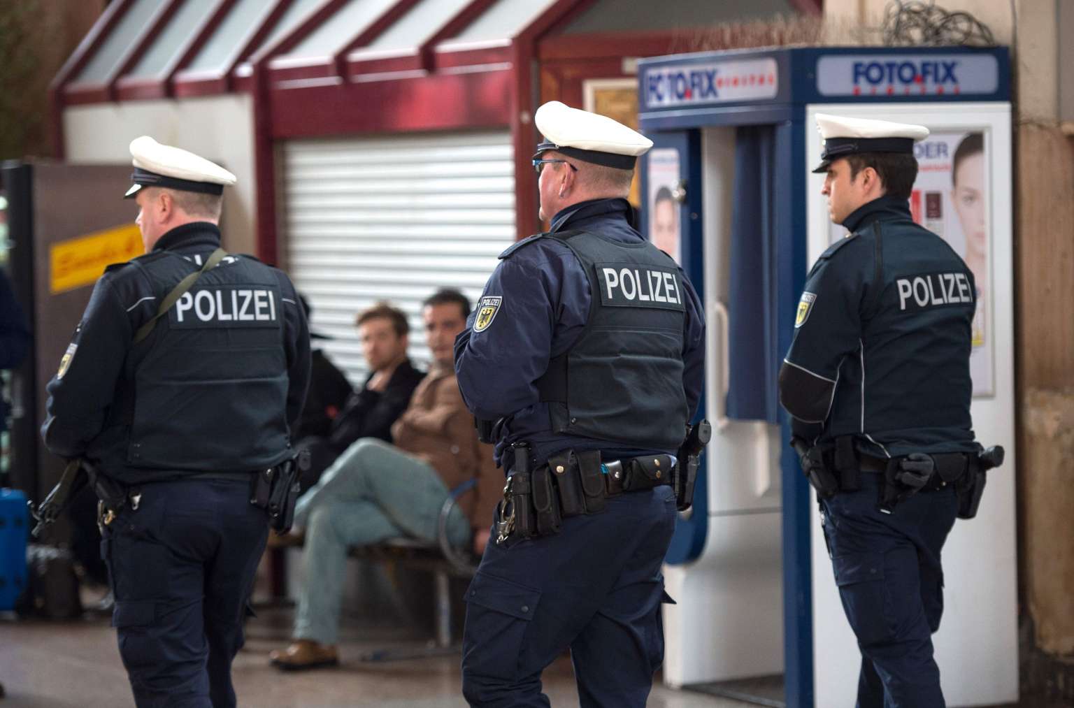 Policemen patrol on March 25, 2016, in front of the main station in Giessen.