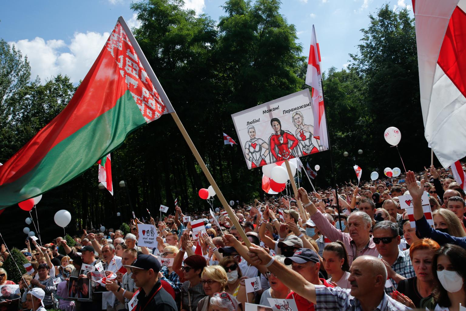 People attend a campaign rally of opposition presidential candidate Svetlana Tikhanovskaya in Baranovichi on Aug 2, 2020.