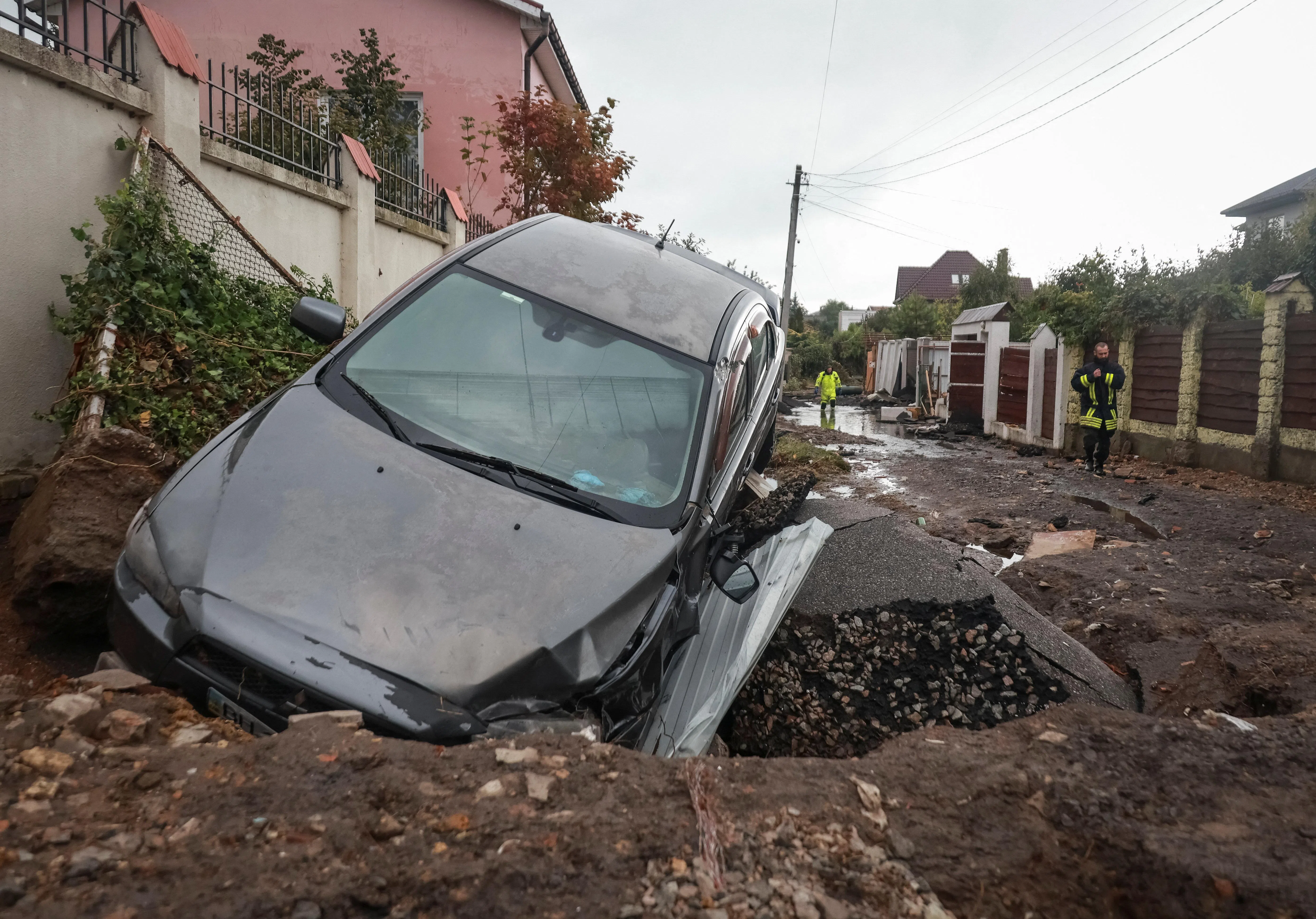 A car stuck in a sinkhole that opened up on a road in Odesa, Ukraine, following unprecedented rainfall.