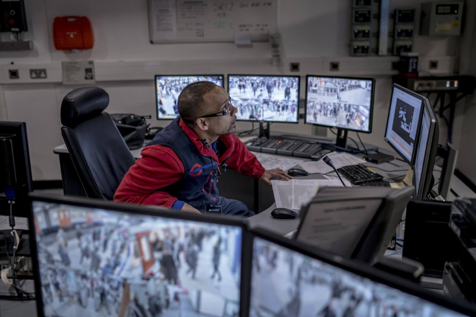 A London Underground employee monitors the feeds in a control room at Victoria Station.