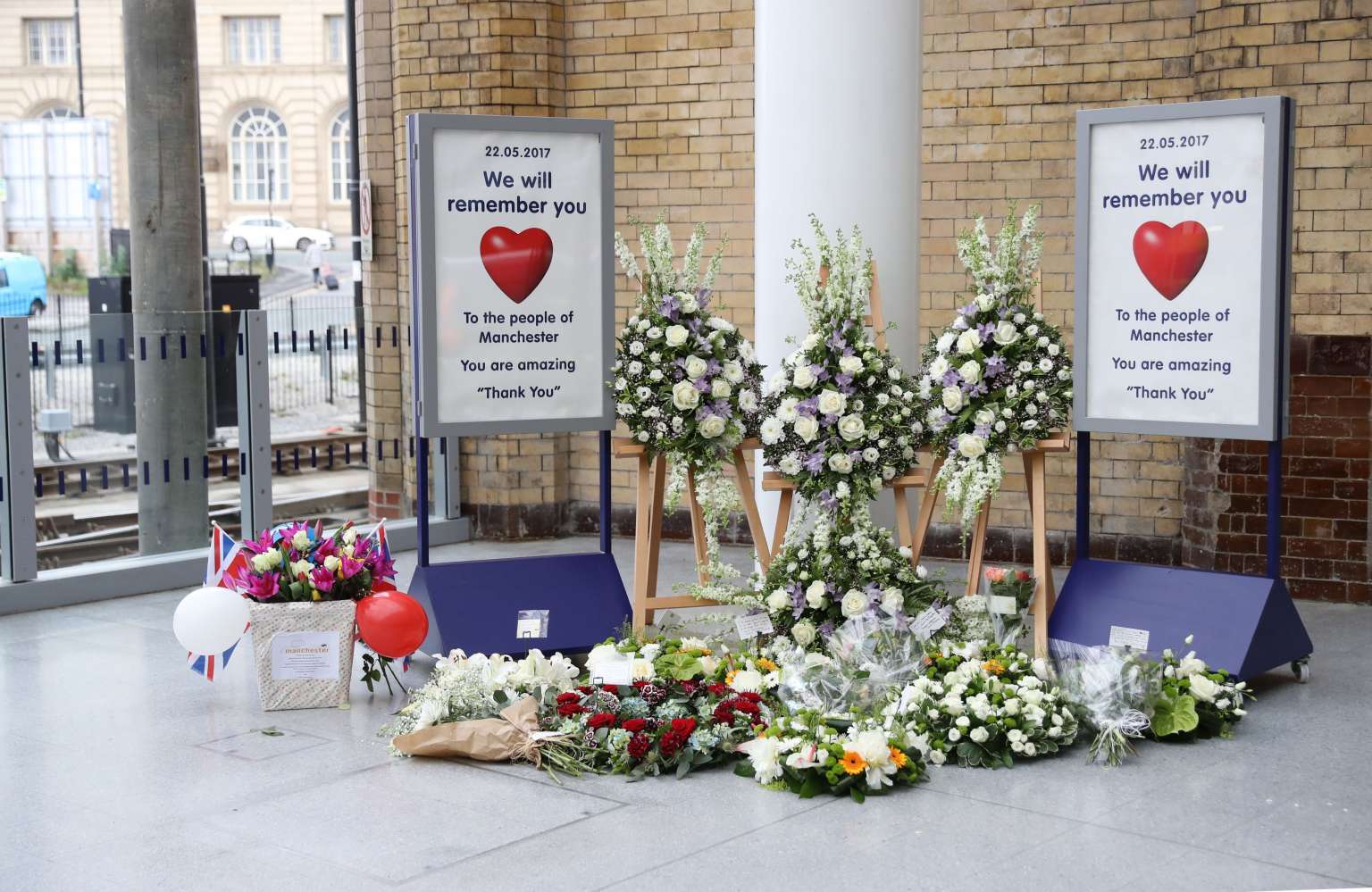Floral tributes are placed at Manchester Victoria railway station on May 30, 2017, in Manchester.