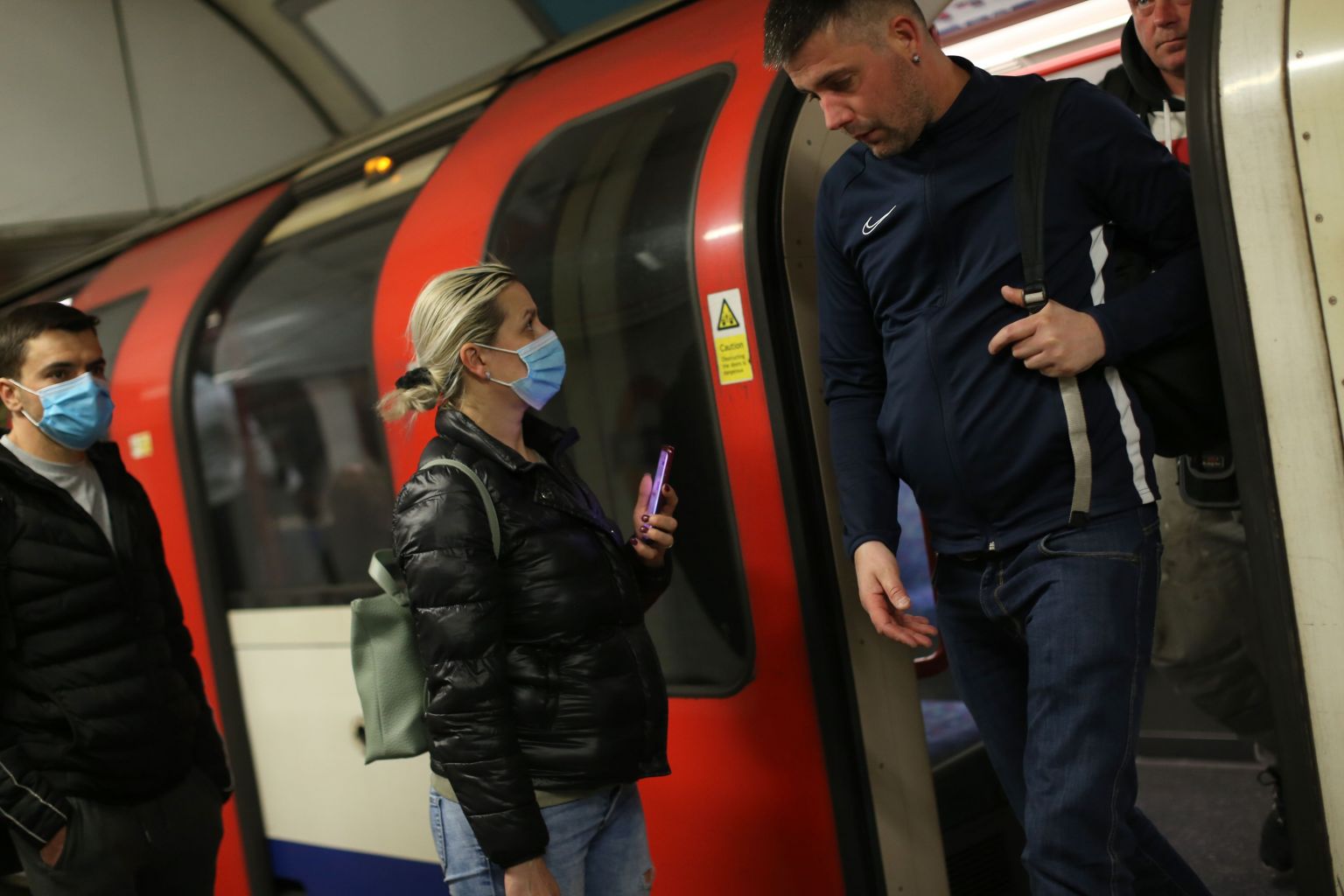 Commuters travel during the evening 'rush hour', on TfL underground trains, in central London, May 14, 2020.
