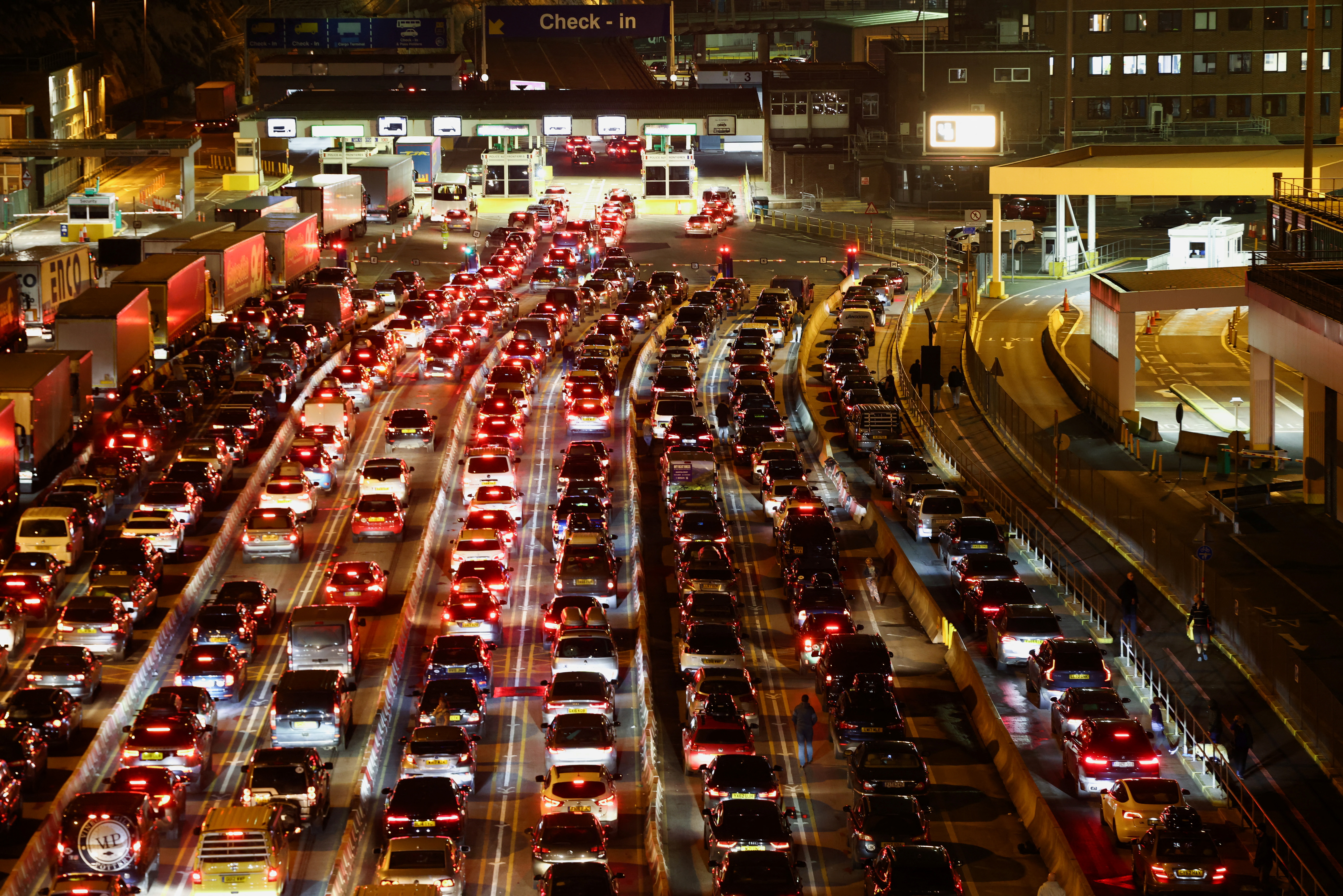 Vehicles queue up at the entrance to the Port of Dover, ahead of travel restrictions between France and Britain.