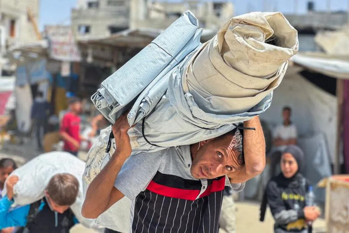 Palestinians moving with their belongings following Israeli evacuation orders for Khan Younis on May 19.