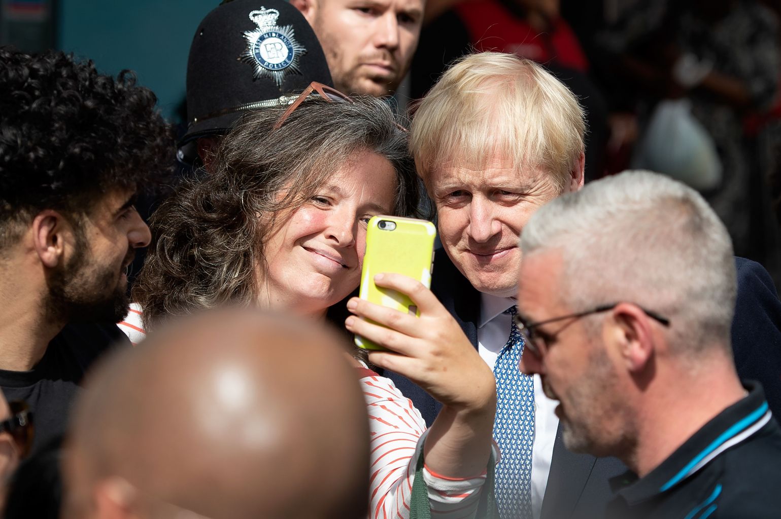 Johnson (centre right) with members of the public on a walkabout in Birmingham, central England.