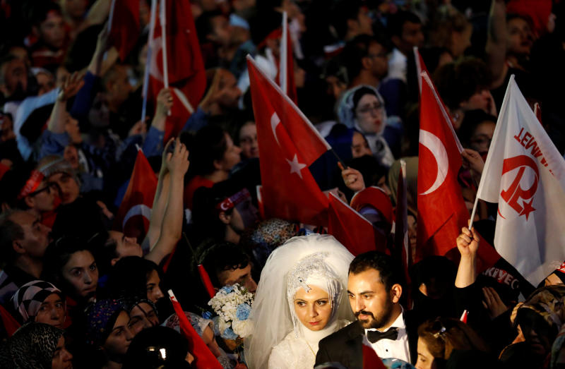 A bride and a groom attend a ceremony marking the first anniversary of the attempted coup in front of the Turkish Parliament in Ankara, Turkey on July 16, 2017.