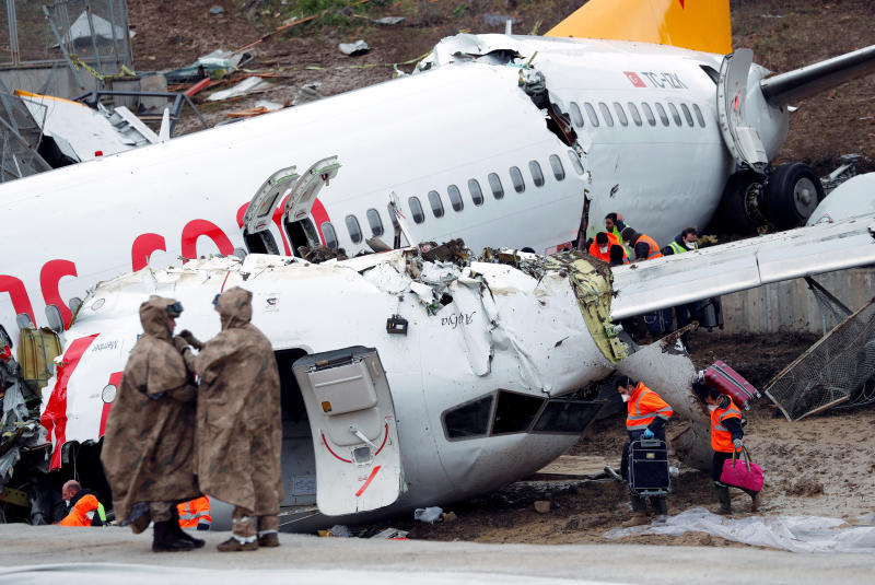 People work at the Pegasus Airlines Boeing 737-86J plane wreckage, after it overran the runway during landing and crashed, at Istanbul's Sabiha Gokcen airport, Turkey, on Feb 6, 2020.