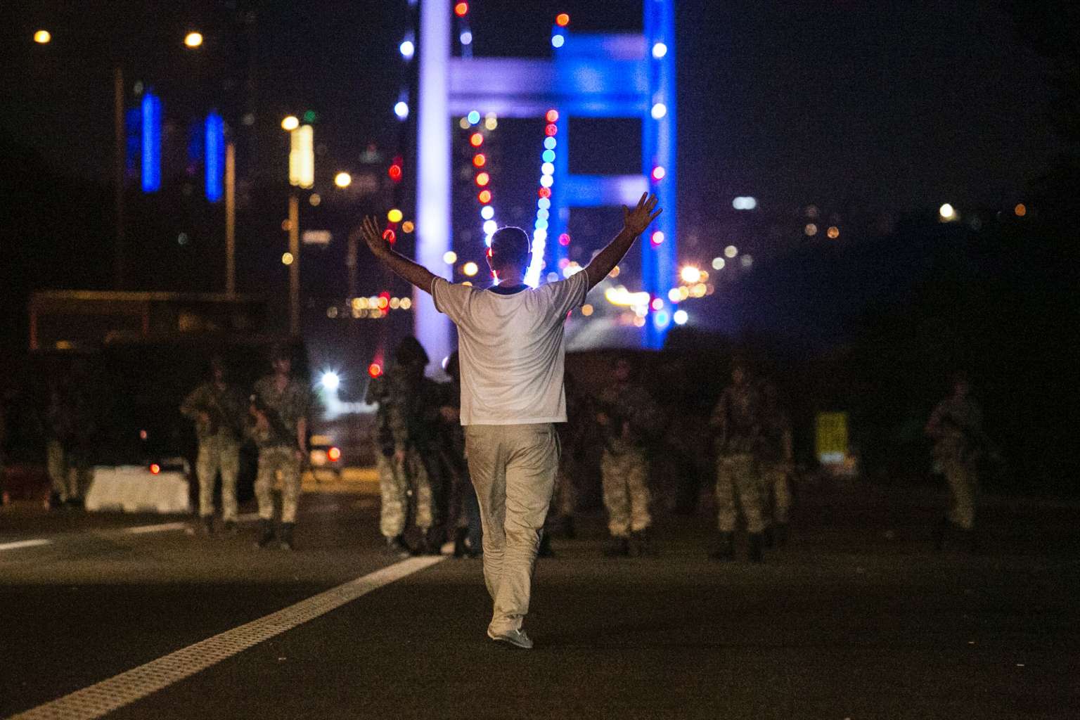 This file photograph taken on July 16, 2016 shows a man approaching Turkish military with his hands up at the entrance to the Bosphorus bridge in Istanbul.