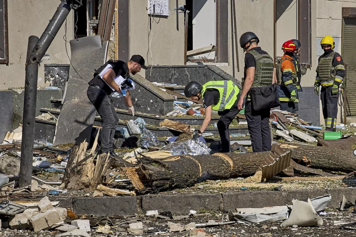 Ukrainian investigators check the body of a victim of Russia’s glide bomb attack on a residential building in Kharkiv, northeastern Ukraine.