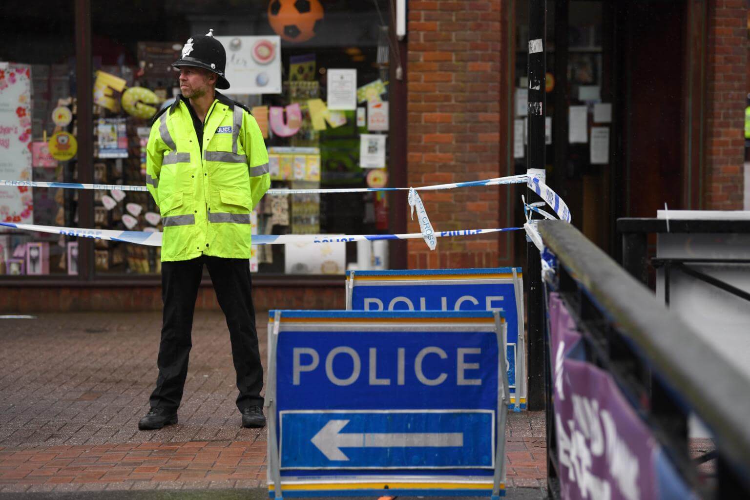 A police officer on duty in a cordoned off area in Salisbury, southern England, on March 10, 2018.